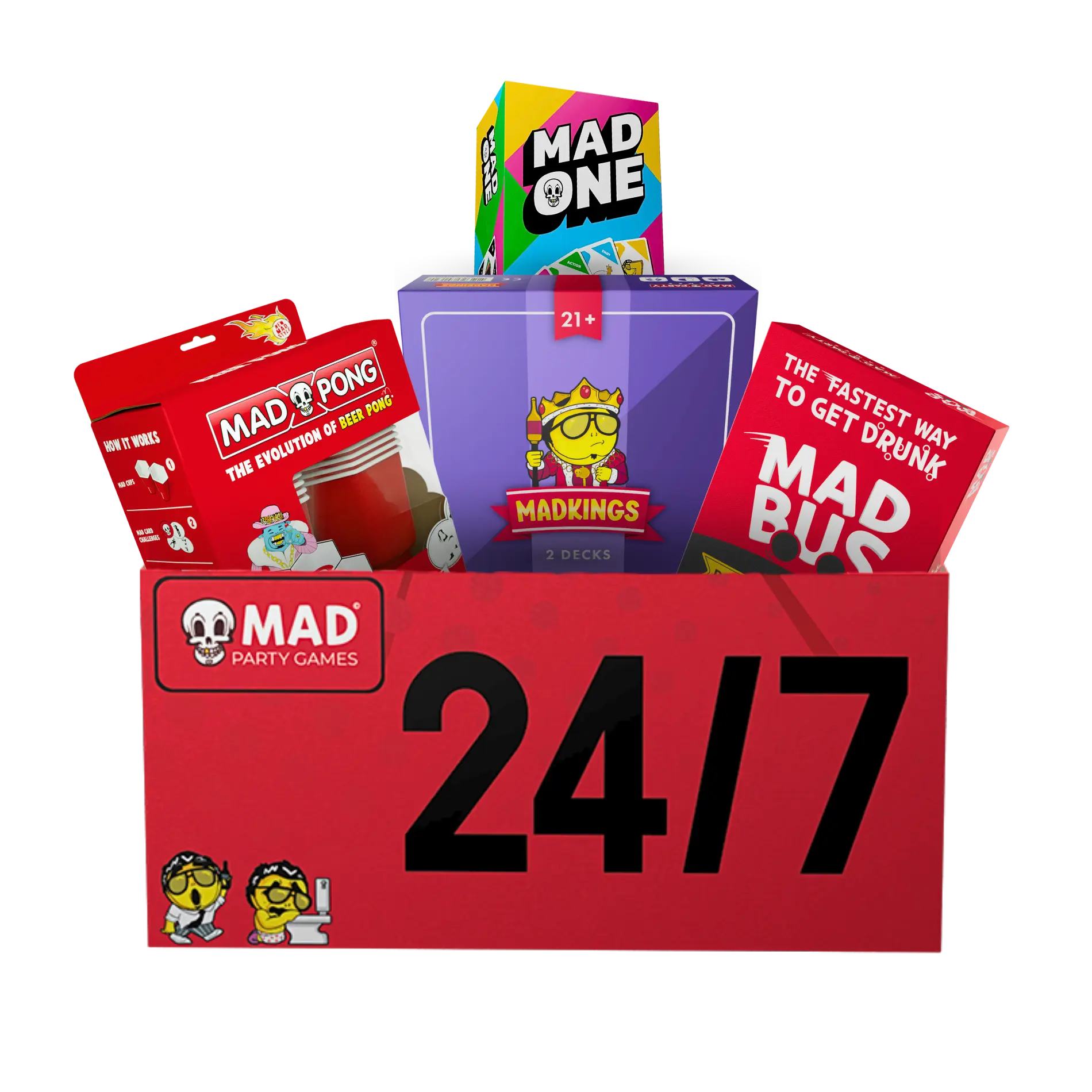 A: MadKings, MadBus and MadOne only need the included cards/die/shot glass plus drinks if you choose to use them. MadPong requires cups, balls and a playable surface; some sets include cups/balls, others only the rules and challenge structure, so always check your SKU.