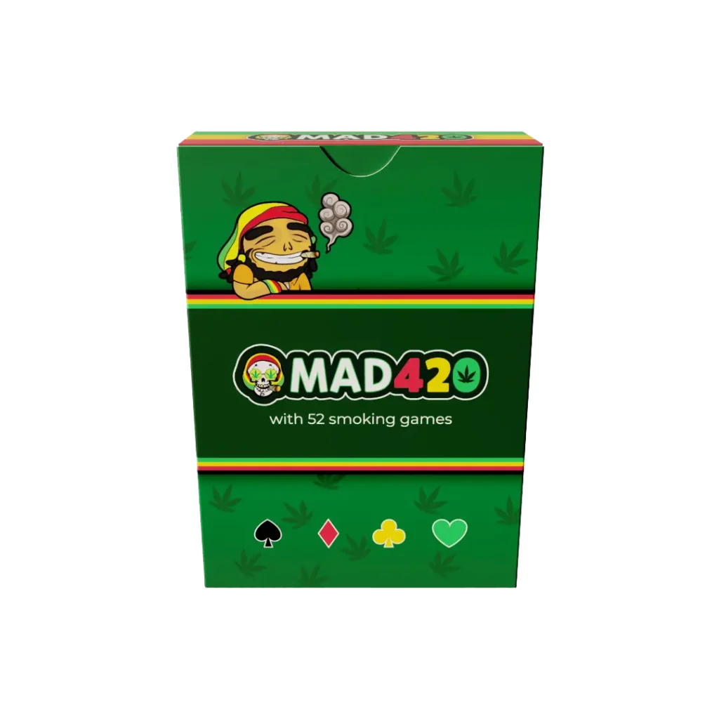 A: Mad420 is a weed-themed party card game with 52 hilarious challenges like Battle, Rule, Game, and Puff Puff Pass — made to light up any smoke session.